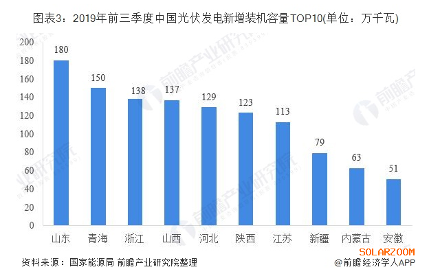具體到各個省份來看,2019年前三季度,山東省新增裝機(jī)容量排名第一,達(dá)到180萬千瓦;青海和浙江緊隨其后,新增裝機(jī)容量分別為150萬千瓦和138萬千瓦。