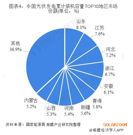 累計(jì)裝機(jī)容量方面,截至2019年第三季度,我國共有9個地區(qū)光伏發(fā)電累計(jì)裝機(jī)容量超過1000萬千瓦。其中山東以1541萬千瓦,排名第一,占全國總裝機(jī)容量的8.1%;江蘇和河北緊隨其后,分別以1445萬千瓦和1363瓦千瓦占全國總裝機(jī)容量的73.6%及7.2%。